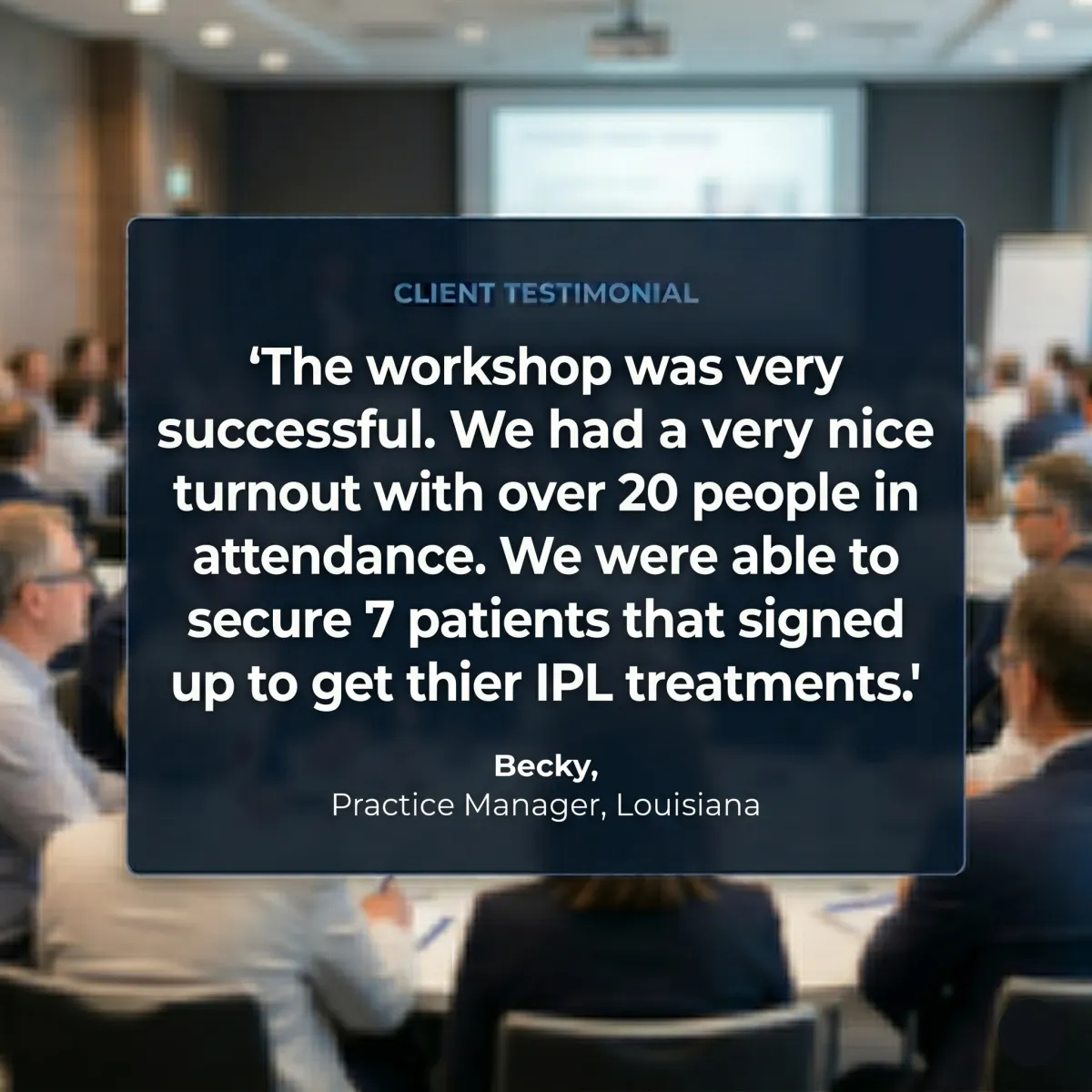 The result: practices consistently enrolling 8–15 cash-pay RF/IPL patients per workshop, with 40–60% of attendees converting on the day of the event.