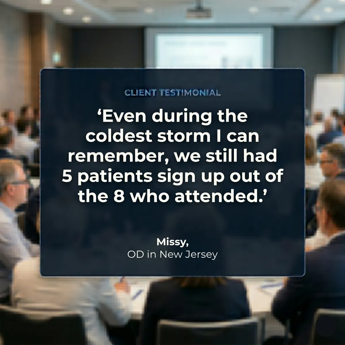 The system is designed to work with 10–20 highly qualified attendees — not hundreds. Even in the smallest markets, there are enough dry eye sufferers to fill a workshop. We've seen practices in small towns get better results than big-city clinics because the competition for educated, ready-to-treat patients is nearly zero.