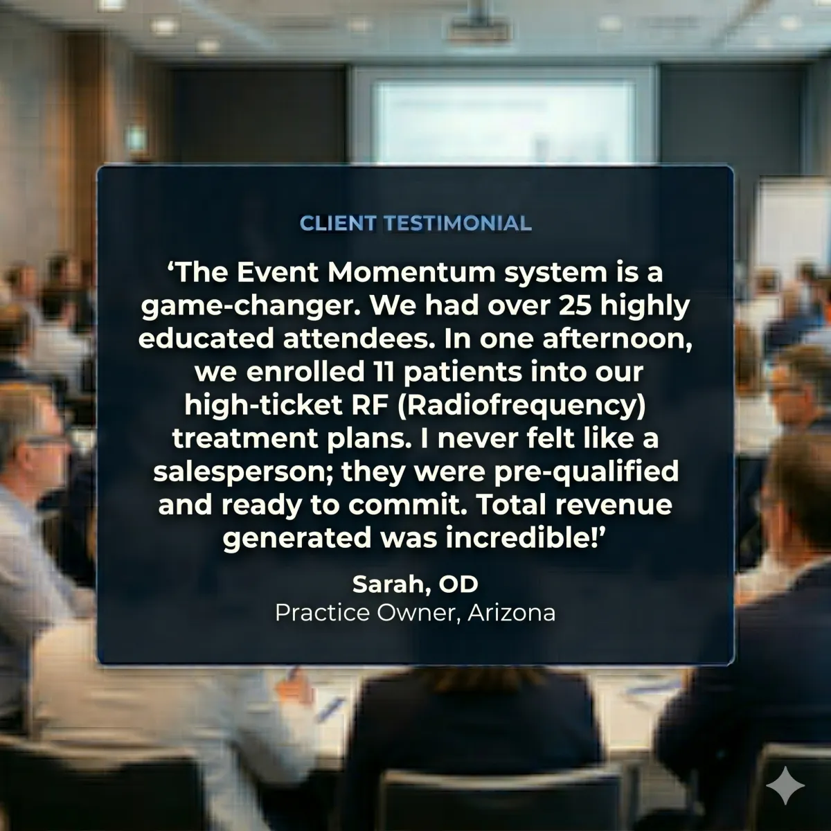 The Event Momentum Method™ replaces the broken "generate leads → chase → consult → hope" cycle with a structured workshop system that pre-educates and pre-qualifies patients in batches — so doctors walk into a room full of people who already understand the treatment, the value, and the investment.